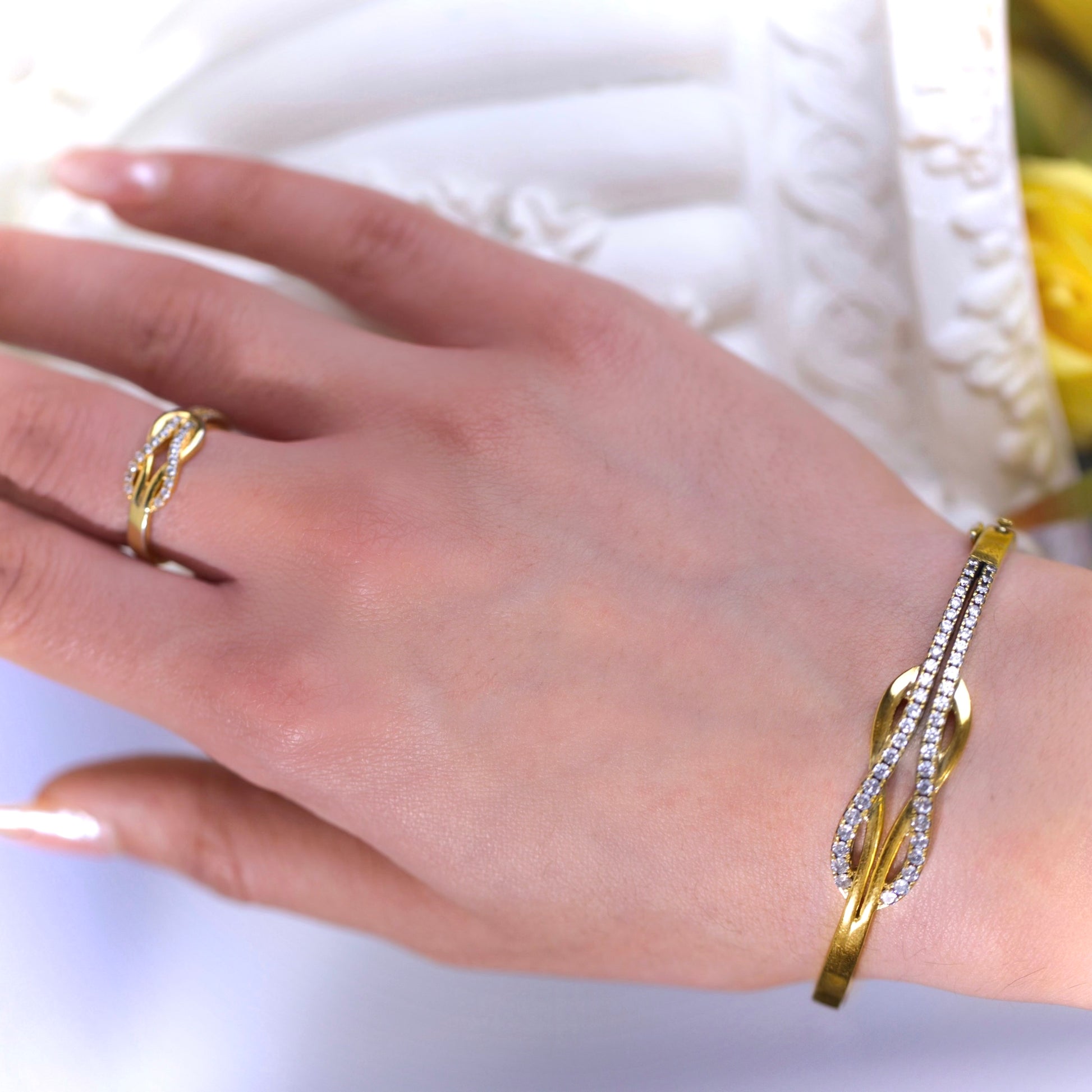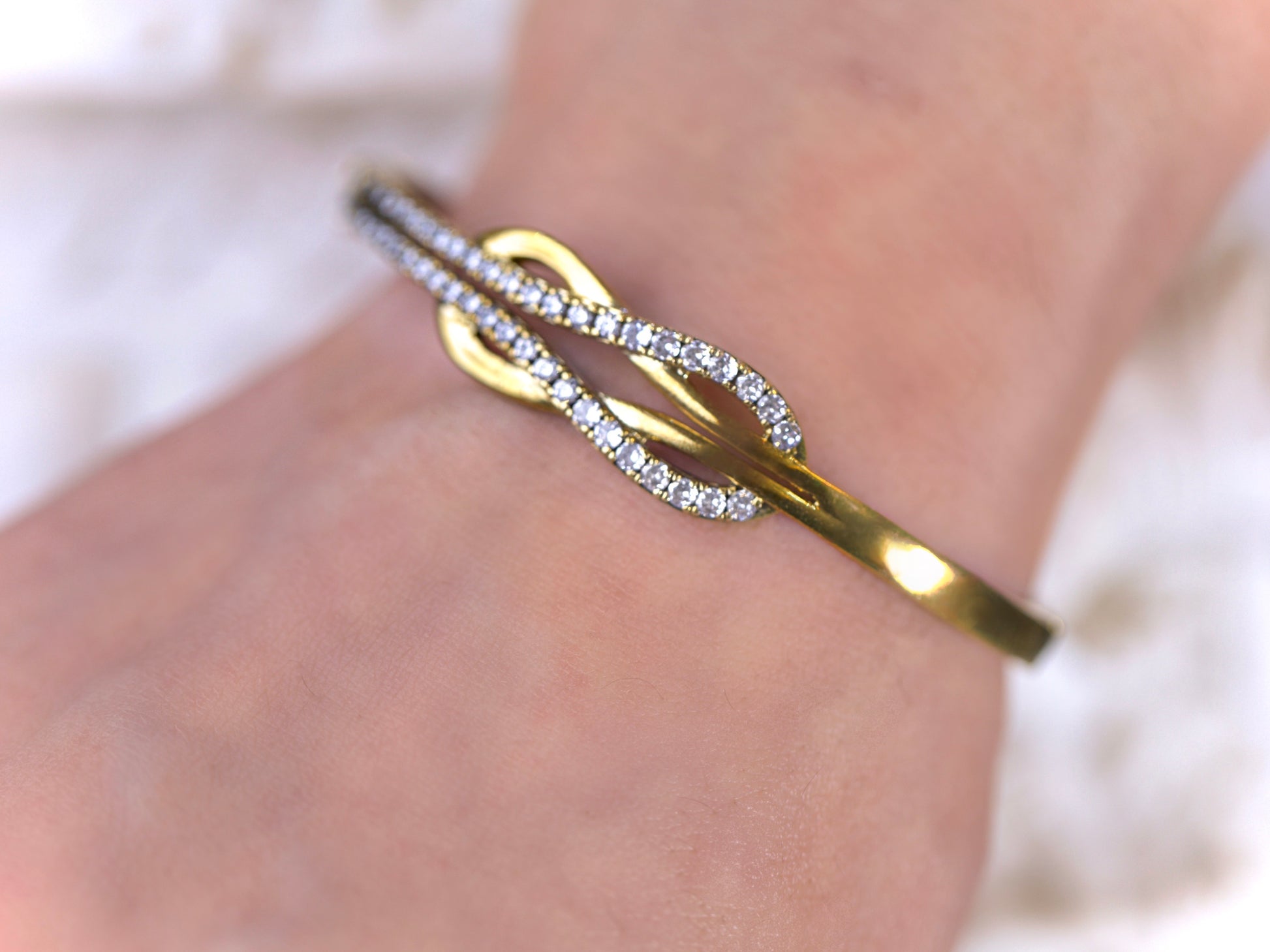 This bracelet features a striking knot design at its centre, inspired by the historic charm of Edinburgh's Old Town. One half of the ring is studded with stones, representing modernity, while the other half remains unadorned, symbolising how modern times are tied to history. This design beautifully embodies the bond that is eternally tied together.